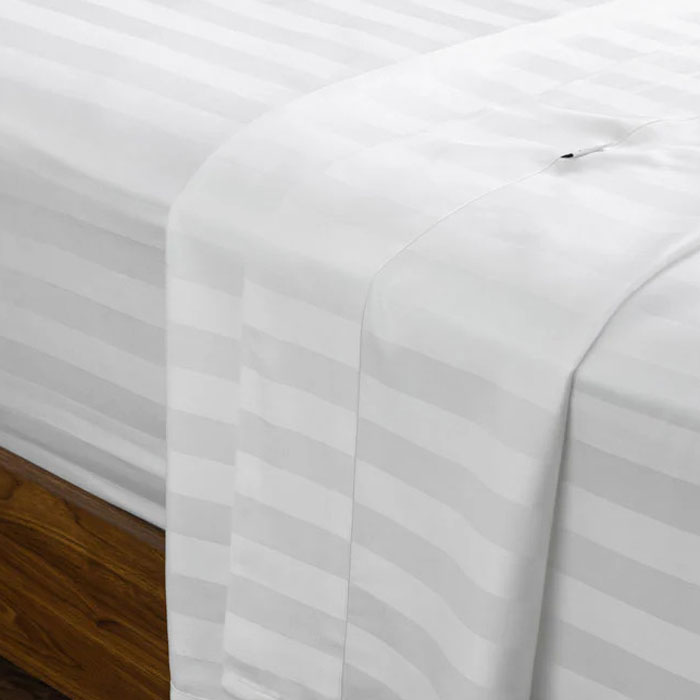 Enhance your bedding with our flat sheet, available in a pristine white color. Crafted from 100% Egyptian cotton with a 3 CM stripe pattern, this sheet offers a silky-smooth feel and elegant look. Choose from a range of thread counts, from 200TC to 800TC, for your desired level of softness and durability. Machine washable for easy care, this flat sheet is designed to provide ultimate comfort and style.